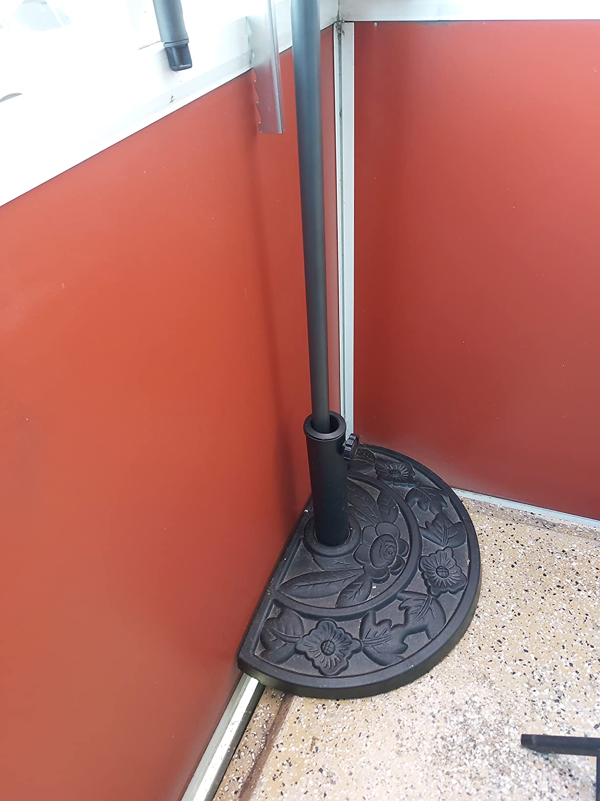 Dit is onze hoogwaardige parasolvoet die uw patio parasol het hele jaar door stevig kan ondersteunen. Het halfronde ontwerp is meer ruimtebesparend en geschikt voor kleinere dekken, balkons of patio's. Hoogwaardig en duurzaam harsmateriaal maakt hem sterk genoeg om in de meeste weersomstandigheden te worden gebruikt. De extra steunbuis heeft een schroefmechanisme om zich aan te passen aan parasol palen van verschillende diameters, zodat uw parasol stabiel en rechtop blijft staan. Het charmante bloemenontwerp zal zeker uw buiten decoratie verbeteren. Perfect voor tuin, binnenplaats, veranda, zwembad, patio, of commercieel gebruik.