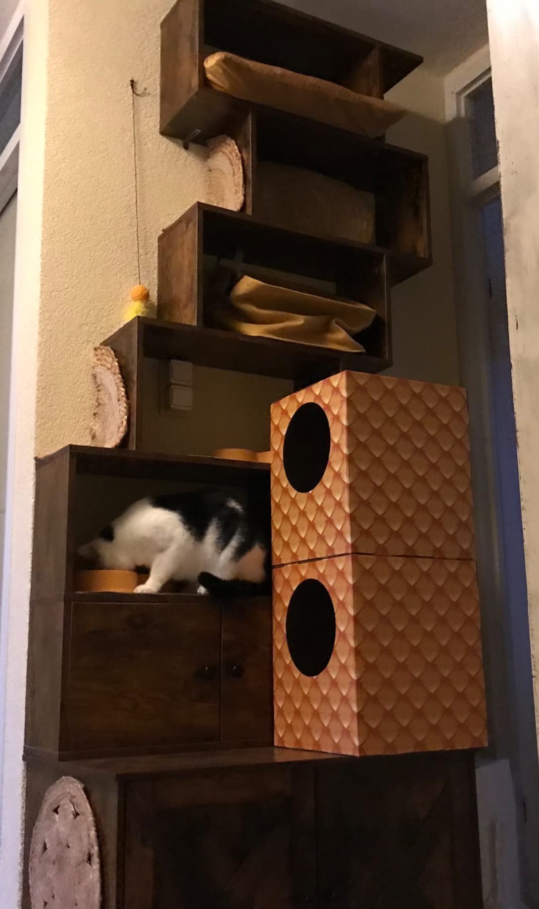 Leuke boekenkastKwaliteit100%Prijs100%Waarde100%Ik heb deze boekenkast gekocht om er een kattentoren van te maken. Hij staat op een kattenbak huisje. We hebben de planken wel op een paar plaatsen omgedraaid zodat er een trapje ontstaat. Achter de gesloten deurtjes bewaar ik het voer. De katten zijn er blij mee en ik ook.
