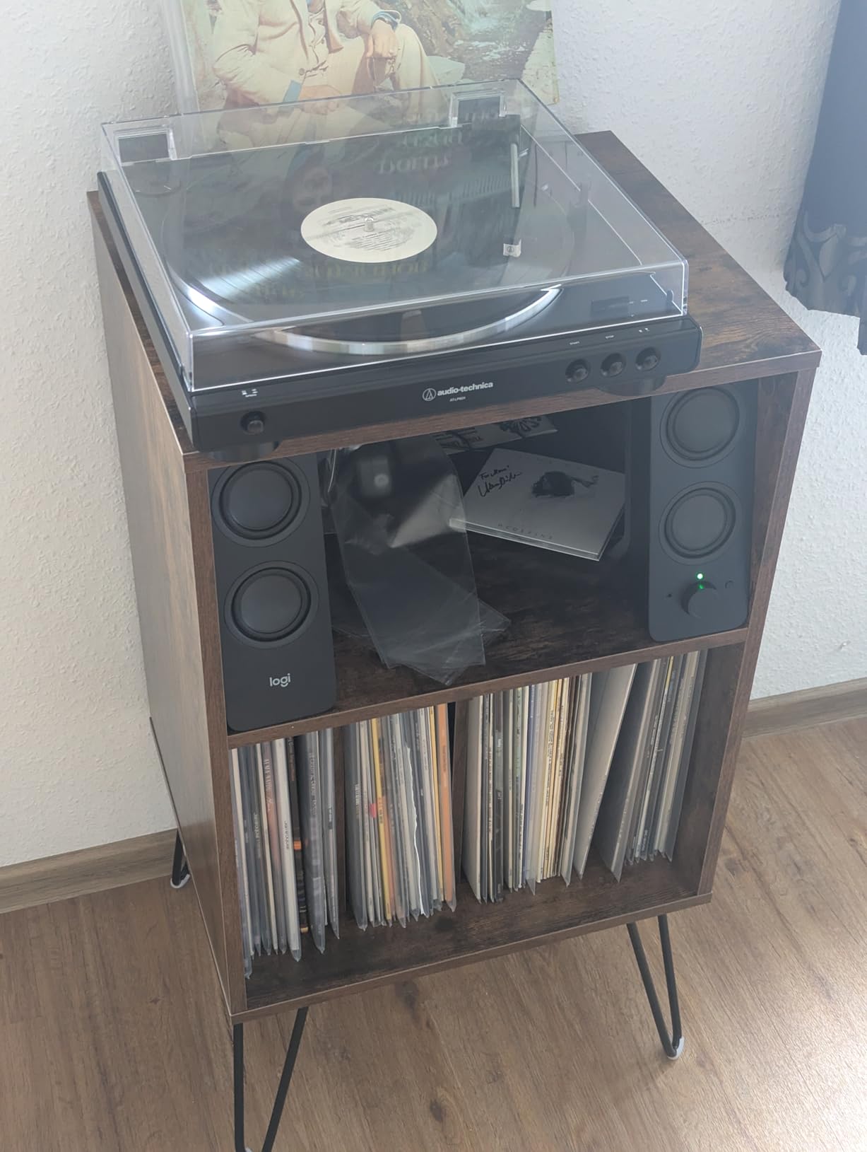 【Meerdere opbergmogelijkheden】Wat maakt het uniek? De platenspelerhouder bevat 4 verdelers voor verschillende albums, zodat je je vinylcollectie netjes kunt organiseren. Naast de ruime lade biedt de open plank gemakkelijke toegang tot je audio-accessoires.