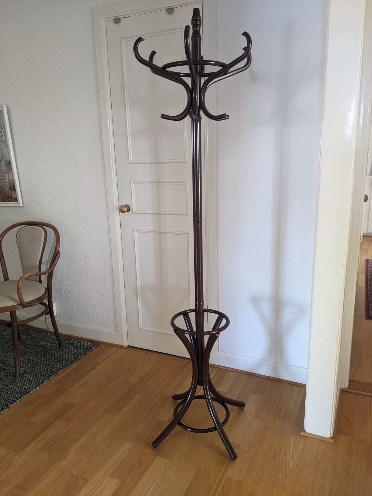 Dit is onze gloednieuwe kapstokstandaard, een perfecte oplossing om uw tas, hoed of kleding gemakkelijk op te bergen. Accentueer traditionele of informele woonkamerinrichting met de unieke styling van deze kapstok. Gebogen haken aan de bovenkant contrasteren prachtig met de anders traditionele stijl van deze hallenboom en voegen een vleugje eigentijdse flair toe. Het is perfect om een vleugje stijl toe te voegen aan je entree. het onderste deel is een uitgehold ontwerp van een paraplubak. Het is even mooi als nuttig. Koop de jouwe vandaag nog!